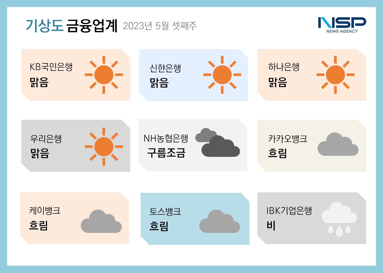 (서울=NSP통신) 강수인 기자 = 2023년 5월 셋째주 금융업계기상도는 KB국민은행·신한은행·하나은행·우리은행·의 ‘맑음’, NH농협은행의 ‘구름조금’, 카카오뱅크·케이뱅크·토스뱅크의 ‘흐림’, IBK기업은행의 ‘비’로 기록됐다.
