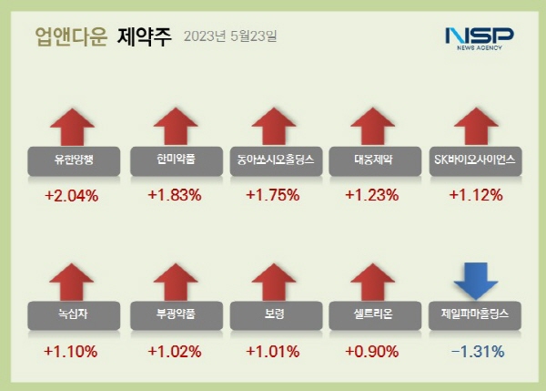 (서울=NSP통신) 김다은 기자 = 23일 코스피(+0.41%)와 코스닥(+0.84%)이 모두 상승한 가운데 제약주(+0.98%) 역시 상승했다. 이중 상승주는 121개였고 하락주는 31개였다. 보합세는 14종목이다.