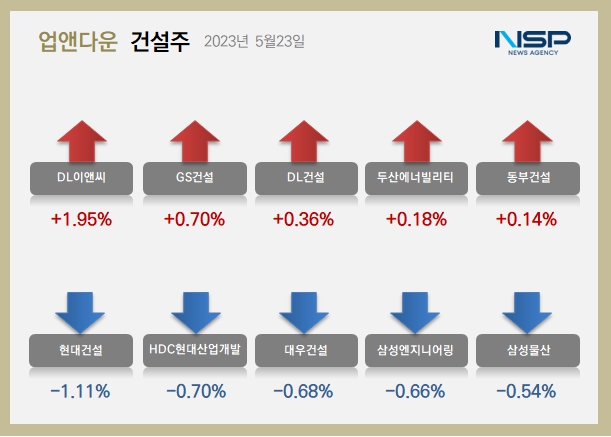 (서울=NSP통신) 정의윤 기자 = 23일 코스피(+0.41%)와 코스닥(+0.84%)는 상승세를 보였다. 건설주는 전일 대비 0.49% 상승했다. 건설주는 80종목 가운데 30종목이 상승, 46종목이 하락했다. 보합세는 4종목이다.