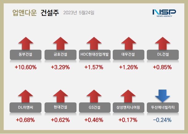 이외에도 대우건설(+1.26%),DL건설(+0.85%),DL이앤씨(+0.68%),현대건설(+0.62%),GS건설(+0.46%),삼성엔지니어링(+0.17%)순으로 상승했다.