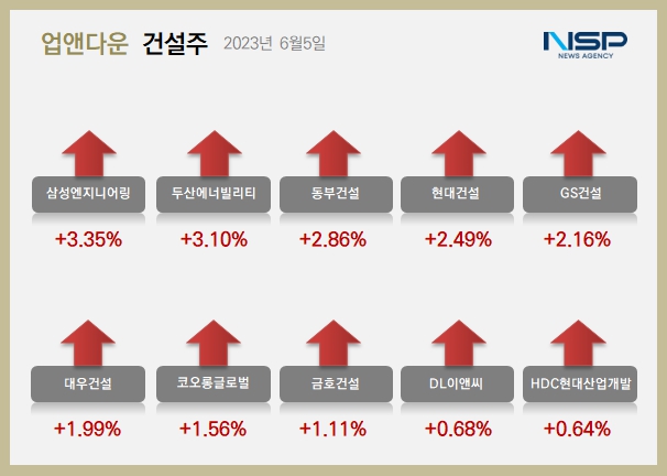 그 외 대우건설(+1.99%),코오롱글로벌(+1.56%),금호건설(+1.11%),DL이앤씨(+0.68%),HDC현대산업개발(+0.64%),삼성물산(+0.55%)순으로 상승했다.