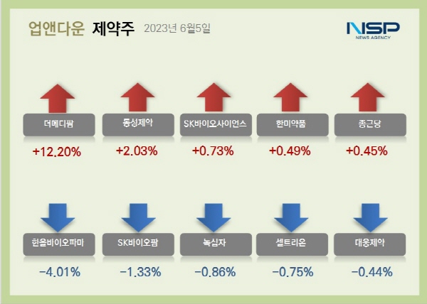 반면 SK바이오팜(-1.33%) 삼성제약(-1.18%) 녹십자(-0.86%) 셀트리온(-0.75%) 대원제약(-0.75%) 보령(-0.55%) 대웅제약(-0.44%) 유한양행(-0.33%) 동아에스티(-0.18%) 등은 하락했다.