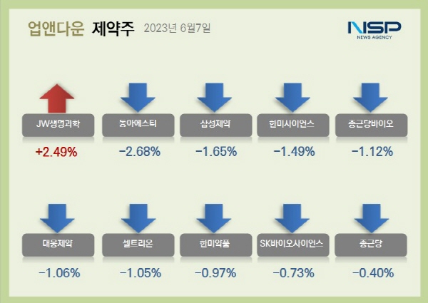 반면 삼성제약(-1.65%) 한미사이언스(-1.49%) 대웅(-1.39%) 종근당바이오(-1.12%) 대웅제약(-1.06%) 영진약품(-1.06%) 셀트리온(-1.05%) 동화약품(-0.99%) 한미약품(-0.97%) 삼진제약(-0.88%) SK바이오사이언스(-0.73%) 종근당(-0.67%) 녹십자(-0.40%) 유한양행(-0.33%) 일동제약(-0.26%) 등은 하락했다.