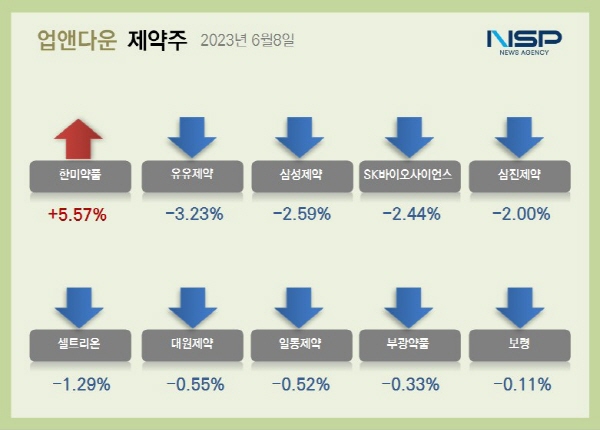 이 밖에 광동제약(+0.63%) JW생명과학(+0.61%) 한미사이언스(+0.55%) 대웅(+0.40%) 등이 상승했다.