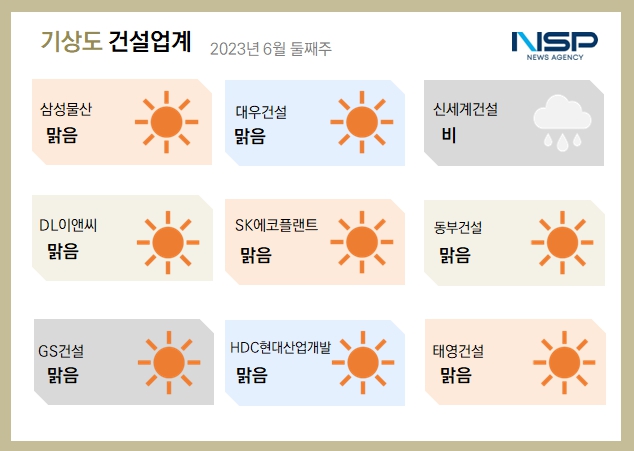 (서울=NSP통신) 정의윤 기자 = 2023년 6월 2주차 건설업계기상도는 삼성물산·DL이앤씨·대우건설·GS건설·SK에코플랜트·HDC현대산업개발·동부건설·태영건설의 ‘맑음’과 신세계건설의 ‘비’로 기록됐다.
