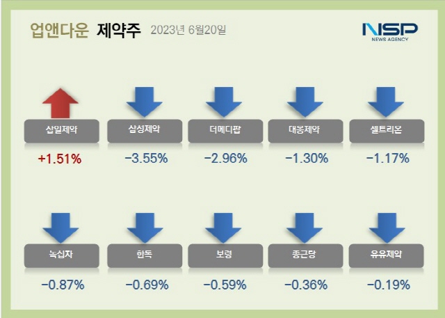 반면 더메디팜(-2.96%) SK바이오팜(-2.34%) 대웅제약(-1.30%) 셀트리온(-1.17%) 한미약품(-1.10%) 제일파마홀딩스(-1.04%) 녹십자(-0.87%) 종근당바이오(-0.79%) 경보제약(-0.70%) 한독(-0.69%) 보령(-0.59%) 일동제약(-0.58%) 종근당(-0.36%) 일양약품(-0.34%) 동아쏘시오홀딩스(-0.22%) 유유제약(-0.19%) 동성제약(-0.17%) 등은 하락했다.