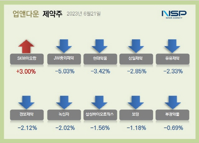 반면 삼성제약(-4.59%) 현대약품(-3.42%) 일동홀딩스(-3.29%) 동아쏘시오홀딩스(-2.88%) 삼일제약(-2.85%) 제일파마홀딩스(-2.50%) 신풍제약(-2.42%) 국제약품(-2.37%) 유유제약(-2.33%) 일동제약(-2.28%) SK바이오사이언스(-2.22%) 경보제약(-2.12%) 대웅제약(-2.06%) 녹십자(-2.02%) 일성신약(-1.99%) 삼성바이오로직스(-1.56%) 광동제약(-1.49%) 셀트리온(-1.30%) 환인제약(-1.25%) 보령(-1.18%) 대원제약(-0.92%) 부광약품(-0.69%) 종근당(-0.36% )등은 하락했다.