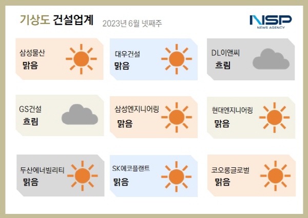 (서울=NSP통신) 정의윤 기자 = 2023년 6월 4주차 건설업계기상도는 삼성물산·대우건설·현대엔지니어링·삼성엔지니어링·두산에너빌리티·SK에코플랜트·코오롱글로벌의 ‘맑음’과 DL이앤씨·GS건설의 ‘흐림’으로 기록됐다.