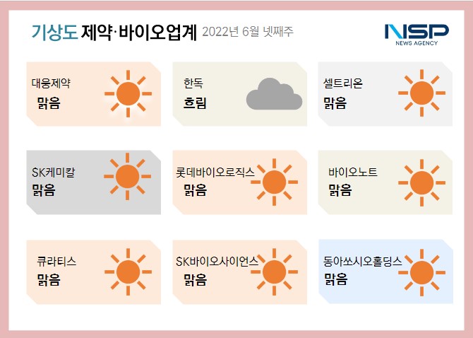 (서울=NSP통신) 김다은 기자 = 2023년 6월 넷째주 제약·바이오업계기상도는 대웅제약·SK케미칼·롯데바이오로직스·바이오노트·셀트리온·큐라티스·SK바이오사이언스·동아쏘시오홀딩스의 ‘맑음’과 한독의 ‘흐림’으로 기록됐다.