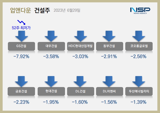 (서울=NSP통신) 정의윤 기자 = 29일 코스피(-0.55%)와 코스닥(-0.60%)는 하락세를 보였다. 건설주는 전일 대비 2.07% 하락했다. 건설주는 83종목 가운데 11종목이 상승, 68종목이 하락했다. 보합세는 4종목이다.