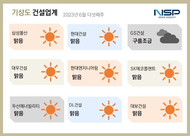 (서울=NSP통신) 정의윤 기자 = 2023년 6월 5주차 건설업계기상도는 삼성물산·현대건설·대우건설·현대엔지니어링·SK에코플랜트·DL건설·두산에너빌리티·대보건설의 ‘맑음’, GS건설의 ‘구름조금’으로 기록됐다.