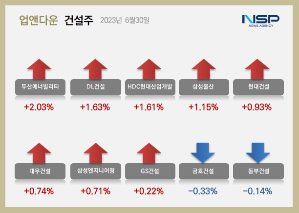 그 외 대우건설(+0.74%),삼성엔지니어링(+0.71%),GS건설(+0.22%)순으로 상승했다.
