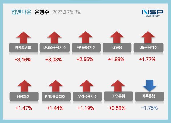 (서울=NSP통신) 강수인 기자 = 3일 코스피(+1.49%)와 코스닥(+2.42%)은 모두 상승했다. 이 가운데 은행주는 전거래일 대비 1.85% 상승했다. 은행주는 11종목 가운데 10종목이 상승, 1종목이 하락했다.