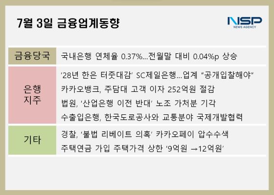 (서울=NSP통신) 강수인 기자 = 약 30년간 한국은행에 출장소로 입점한 SC제일은행을 두고 은행권은 “공개입찰을 해야한다”며 한 목소리를 내고 있다. 한편 경찰은 불법 리베이트 의혹을 받고 있는 카카오페이 본사를 압수수색했다.