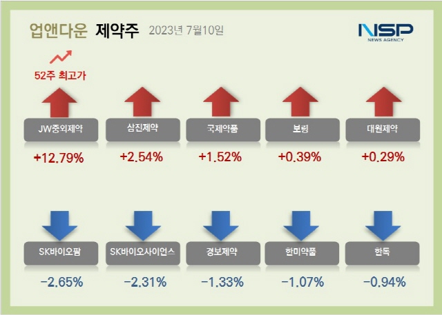 이날 제약주 중 가장 큰 상승률을 보인 종목은 JW중외제약이다. JW중외제약은 전거래일대비 12.79%(3050원) 올라 2만6900원에 장을 마감했다. JW중외제약은 장중 2만7650원을 기록하며 52주 최고가를 기록했다.