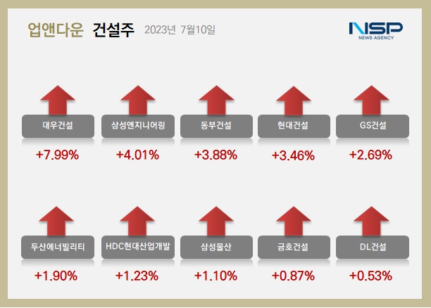 그 외 삼성물산(+1.10%),금호건설(+0.87%),DL건설(+0.53%),DL이앤씨(+0.32%)순으로 상승했다.