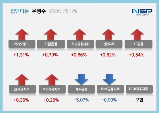 (서울=NSP통신) 강수인 기자 = 10일 코스피(-0.24%)와 코스피(-0.80%)가 모두 하락한 가운데 은행주는 전거래일 대비 0.60% 상승했다. 은행주는 11종목 중 8종목이 상승, 2종목이 하락했다. 보합세는 1종목이다.
