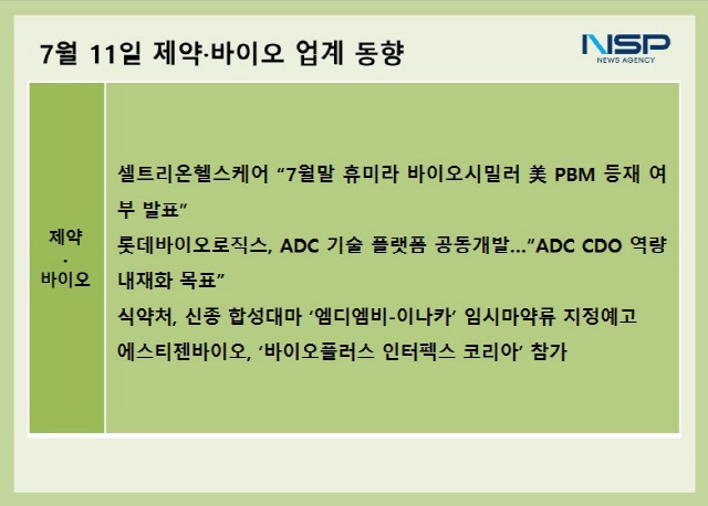 (서울=NSP통신) 김다은 기자 = 셀트리온헬스케어가 이달 말까지 휴미라 바이오시밀러 ‘유플라이마’의 미국 처방약급여관리업체(PBM) 등재 결과를 발표할 예정이다. 이와 함께 롯데바이오로직스가 ADC 기술 플랫폼 내재화를 위해 카나프테라퓨틱스와 공동 개발에 나선다.