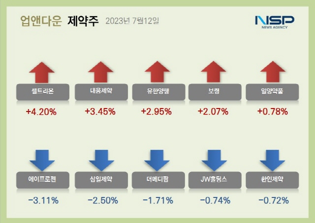 이 밖에 일동제약(+2.73%) JW중외제약(+2.37%) 일동홀딩스(+2.27%) 보령(+2.07%) 대웅(+2.06%) 경보제약(+1.51%) 삼성바이오로직스(+0.97%) SK바이오사이언스(+0.94%) 종근당(+0.92%) 한미약품(+0.91%) 유유제약(+0.79%) 광동제약(+0.79%) 일양약품(+0.78%) 하나제약(+0.74%) 한올바이오파마(+0.72%) 동화약품(+0.70%) 녹십자홀딩스(+0.60%) 한미사이언스(+0.49%) 녹십자(+0.45%) 삼진제약(+0.23%) 종근당홀딩스(+0.21%) 이연제약(+0.13%) 등이 상승했다.