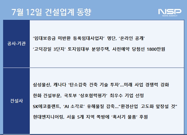(서울=NSP통신) 정의윤 기자 = 삼성물산 건설부문은 캐나다 카본큐어사의 저탄소 콘크리트 기술 투자를 통해 미래 탄소저감 사업 경쟁력 확보에 나선다. 이와 함께 국토교통부는 임대보증금 미반환으로 인한 등록임대사업자 정보를 온라인으로 공개한다고 밝혔다.