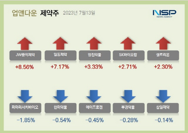 이 밖에 영진약품(+3.33%) 녹십자홀딩스(+2.83%) SK바이오팜(+2.71%) 현대약품(+2.60%) 동아쏘시오홀딩스(+2.52%) 삼성바이오로직스(+2.47%) 셀트리온(+2.30%) 보령(+2.28%) 일양약품(+2.21%) 녹십자(+2.16%) 명문제약(+2.02%) 종근당바이오(+1.95%) 종근당(+1.82%) 제일약품(+1.58%) 이연제약(+1.54%) 한독(+1.31%) 광동제약(+1.25%) 대웅제약(+1.25%) 경보제약(+0.89%) 동아에스티(+0.75%) 환인제약(+0.58%) 유유제약(+0.39%) 더메디팜(+0.39%) 대원제약(+0.29%) 등이 상승했다.