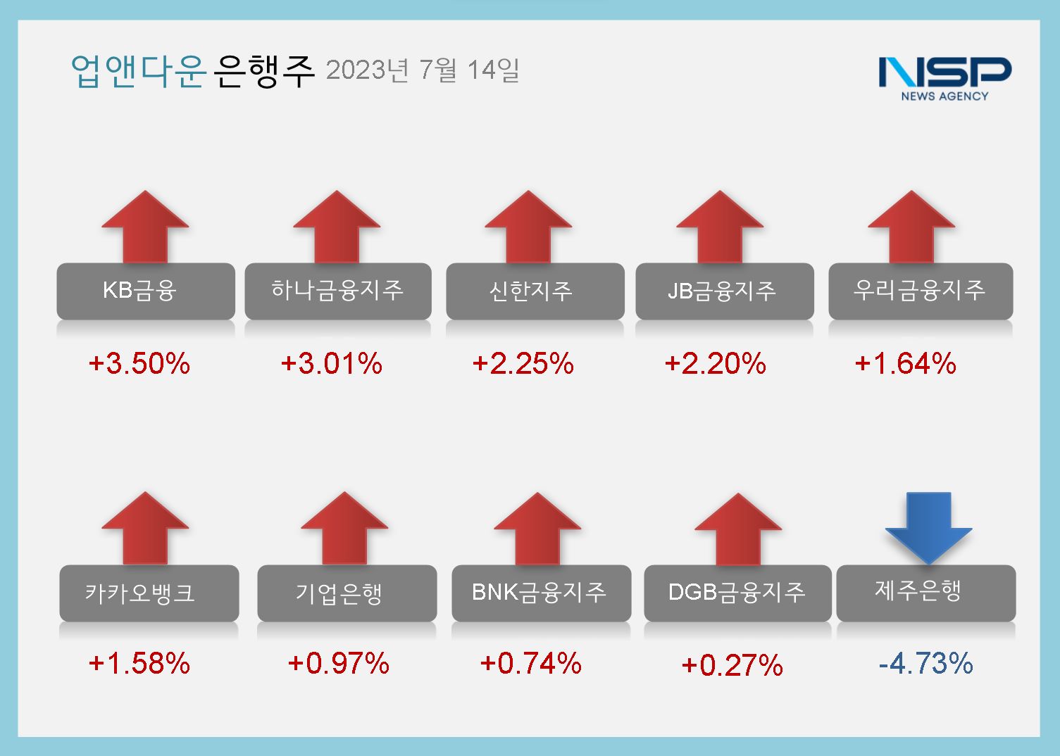 (서울=NSP통신) 강수인 기자 = 14일 코스피(+1.43%)와 코스닥(+1.70%)이 모두 상승한 가운데 은행주는 전거래일 대비 2.26% 상승했다. 은행주는 11종목 중 10종목이 상승, 1종목이 하락했다.