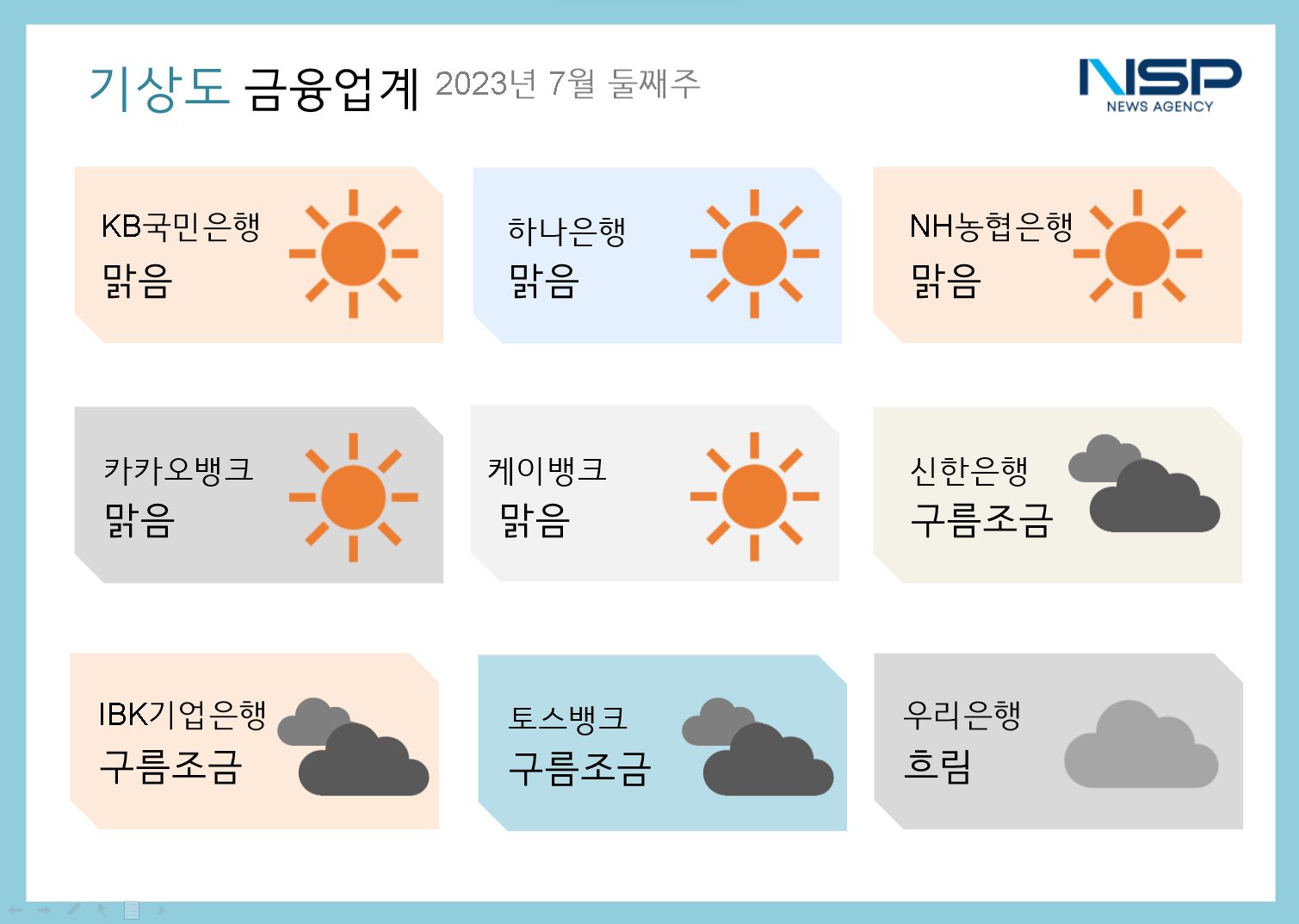 (서울=NSP통신) 강수인 기자 = 2023년 7월 2주차 금융업계기상도는 KB국민은행·하나은행·NH농협은행·카카오뱅크·케이뱅크의 ‘맑음’, 신한은행·IBK기업은행·토스뱅크의 ‘구름조금’, 우리은행의 ‘흐림’으로 기록됐다.