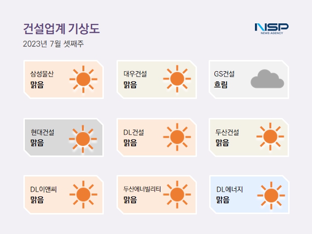 (서울=NSP통신) 정의윤 기자 = 2023년 7월 3주차 건설업계기상도는 삼성물산·현대건설·DL이앤씨·대우건설·DL건설·두산에너빌리티·DL에너지·두산건설의 ‘맑음’, GS건설의 ‘흐림’로 기록됐다.