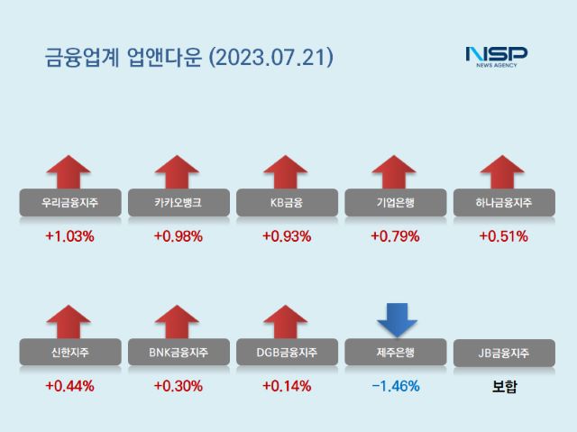 (서울=NSP통신) 강수인 기자 = 21일 코스피(+0.37%)와 코스닥(+0.32%)은 모두 상승했다. 이 가운데 은행주는 전거래일 대비 0.71% 상승했다. 은행주는 11종목 가운데 8종목이 상승, 2종목이 하락했다. 보합세는 1종목이다.