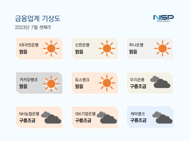(서울=NSP통신) 강수인 기자 = 2023년 7월 3주차 금융업계 기상도는 KB국민은행·신한은행·하나은행·카카오뱅크·토스뱅크의 ‘맑음’, 우리은행·NH농협은행·IBK기업은행·케이뱅크의 ‘구름조금’으로 기록됐다.
