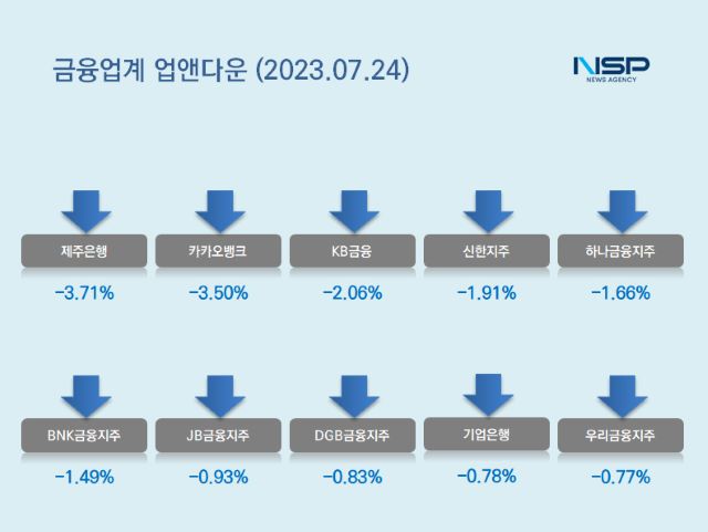 (서울=NSP통신) 강수인 기자 = 24일 코스피(+0.72%)와 코스닥(-0.50%)은 상승과 하락이 엇갈렸다. 이 가운데 은행주는 전거래일 대비 1.88% 하락했다. 은행주는 11종목 모두 하락했다.