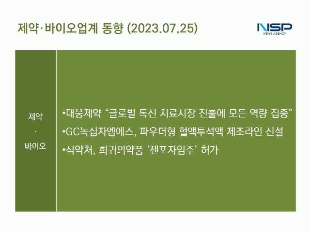 (서울=NSP통신) 김다은 기자 = 대웅제약의 미국 파트너사 ‘이온바이오파마’가 뉴욕 증시에 상장했다. 이와 함께 GC녹십자엠에스가 파우더형 혈액투석액 제조라인의 공장을 신설하기로 했다.