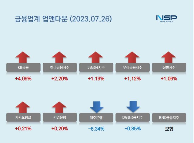 (서울=NSP통신) 강수인 기자 = 26일 코스피(-1.67%)와 코스닥(-4.18%)은 모두 하락했다. 이 가운데 은행주는 전거래일 대비 1.67% 상승했다. 은행주는 11종목 가운데 7종목이 상승, 3종목이 하락했다. 보합세는 1종목이다.