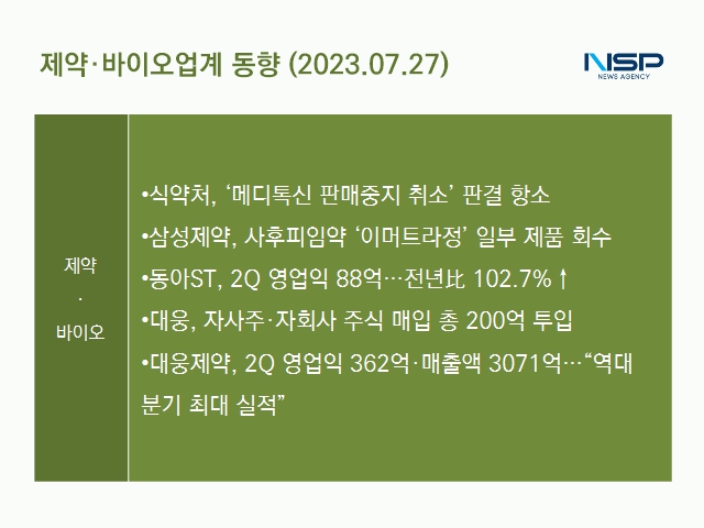 (서울=NSP통신) 김다은 기자 = 보툴리눔톡신 제제 간접수출 건과 관련해 메디톡스를 상대로 패소한 식품의약품안전처가 1심 판결에 불복하며 항소했다. 이와 함께 삼성제약의 사후피임약 ‘이머트라정(성분명 레보노르게스트렐)’이 식품의약품안전처로부터 일부 제품에 대한 회수 조치를 받았다.