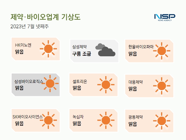 (서울=NSP통신) 김다은 기자 = 2023년 7월 넷째주 제약·바이오업계기상도는 HK이노엔·광동제약·한올바이오파마·삼성바이오로직스·셀트리온·대웅제약·SK바이오사이언스·녹십자의 ‘맑음’과 삼성제약의 ‘구름조금’으로 기록됐다.