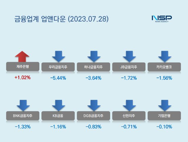 그 외 KB금융 -1.16%(600원), DGB금융지주 -0.83%(60원), 신한지주 -0.71%(250원), 기업은행 -0.10%(10원) 순으로 기록됐다.