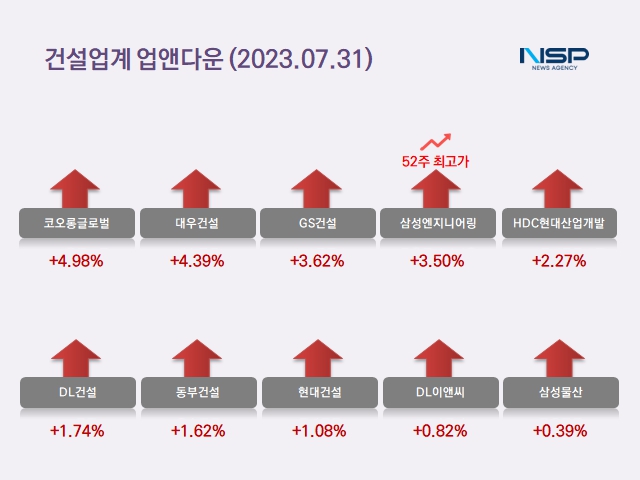 그 외 동부건설(+1.62%),현대건설(+1.08%),DL이앤씨(0.82%),삼성물산(+0.39%)순으로 상승했다.