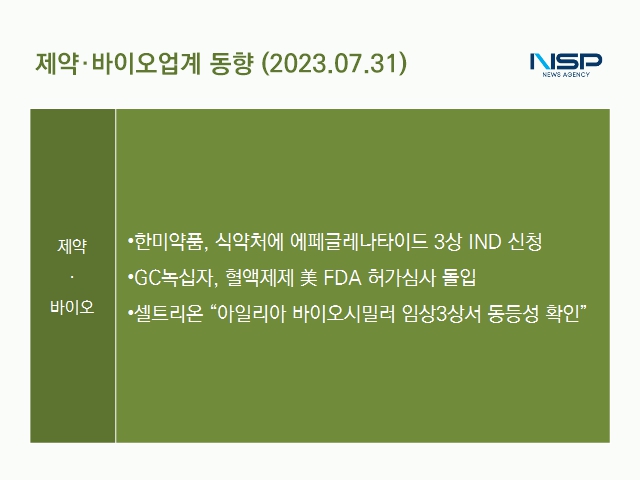 (서울=NSP통신) 김다은 기자 = 한미약품이 주사 제형의 대사질환 치료제로 개발해 온 ‘에페글레나타이드’를 비만치료제로 적응증을 변경하기 위한 발걸음을 내디뎠다. 이와 함께 GC녹십자의 혈액제제 ‘GC5107B(정맥투여용 면역글로불린10%)’에 대한 품목허가 신청서(BLA)가 미국 식품의약국(FDA)의 본격적인 허가심사 절차에 돌입했다.