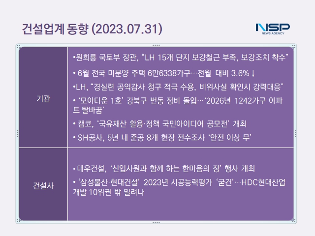 (서울=NSP통신) 정의윤 기자 = HDC현대산업개발은 지난 2022년 시공능력평가 10위 자리에서 올해 호반건설에 자리를 빼앗기며 TOP10위권 밖으로 밀려났다. 이와 함께 원희룡 국토교통부 장관은 철근이 누락된 LH 아파트 15곳을 공개하고 즉시 보강조치에 착수한다고 밝혔다.