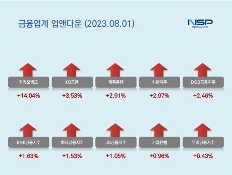 KB금융은 전거래일 대비 3.53%(1800원) 올라 5만2800원으로 장을 마감했고 제주은행은 전거래일 대비 2.91%(290원) 상승해 1만260원으로 장을 마쳤다.