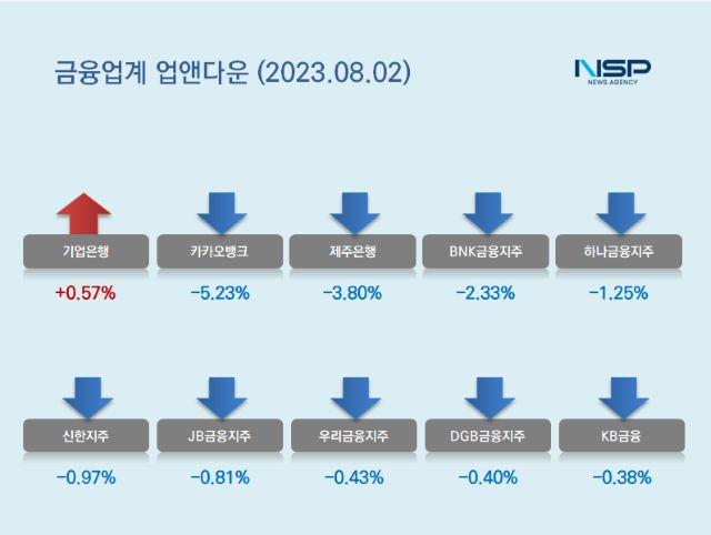 이날 유일하게 상승한 종목은 기업은행이다. 기업은행은 전거래일 대비 0.57%(60원) 올라 1만550원으로 장을 마쳤다.