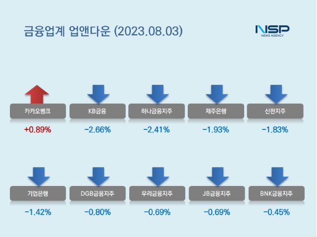(서울=NSP통신) 강수인 기자 = 3일 코스피(-0.40%)와 코스닥(+1.16%)은 하락과 상승이 엇갈렸다. 이 가운데 은행주는 전거래일 대비 1.45% 하락했다. 은행주는 11종목 가운데 1종목이 상승, 10종목이 하락했다.