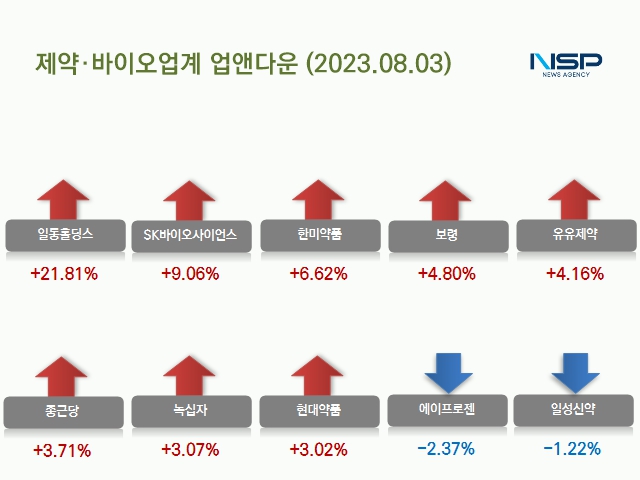 이 밖에 제일파마홀딩스(+4.90%) 보령(+4.80%) 삼일제약(+4.42%) 종근당바이오(+4.28%) 유유제약(+4.16%) 대원제약(+4.00%) SK바이오팜(+3.85%) JW홀딩스(+3.77%) 종근당(+3.71%) 더메디팜(+3.42%) 경보제약(+3.32%) 녹십자홀딩스(+3.23%) 녹십자(+3.07%) 현대약품(+3.02%) 부광약품(+2.84%) 삼성바이오로직스(+2.28%) 셀트리온(+2.16%) 일양약품(+1.99%) 광동제약(+1.85%) 한독(+1.82%) 동아쏘시오홀딩스(+1.69%) 유한양행(+0.96%) 환인제약(+0.36%) 등이 상승했다.