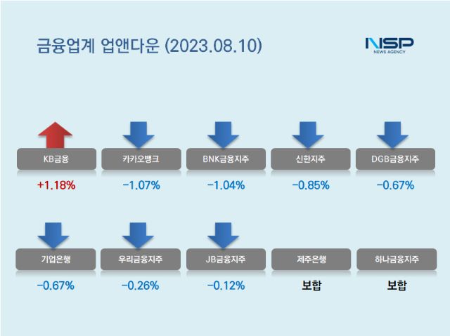 (서울=NSP통신) 강수인 기자 = 10일 코스피(-0.14%)와 코스닥(+0.25%)은 하락과 상승이 엇갈렸다. 이 가운데 은행주는 전거래일 대비 0.25% 하락했다. 은행주는 11종목 가운데 2종목이 상승, 7종목이 하락했다. 2종목은 보합세를 유지했다.