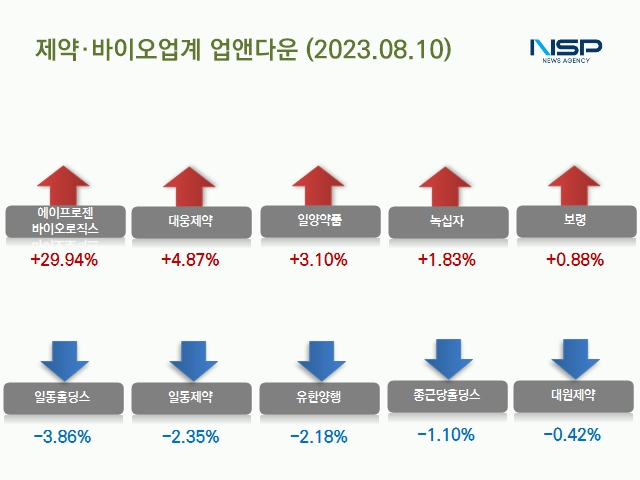 이 밖에 더메디팜(+3.66%) 제일파마홀딩스(+3.53%) 일양약품(+3.10%) 광동제약(+2.65%) 유유제약(+2.32%) 동아쏘시오홀딩스(+2.18%) 부광약품(+1.98%) 녹십자(+1.83%) 한미약품(+1.54%) SK바이오사이언스(+1.54%) 한올바이오파마(+1.45%) 동아에스티(+1.45%) 신풍제약(+1.36%) 현대약품(+1.31%) 유나이티드제약(+1.03%) 보령(+0.88%) 삼진제약(+0.86%) 셀트리온(+0.77%) 삼성바이오로직스(+0.50%) 종근당(+0.47%) SK바이오팜(+0.40%) 등이 상승했다.