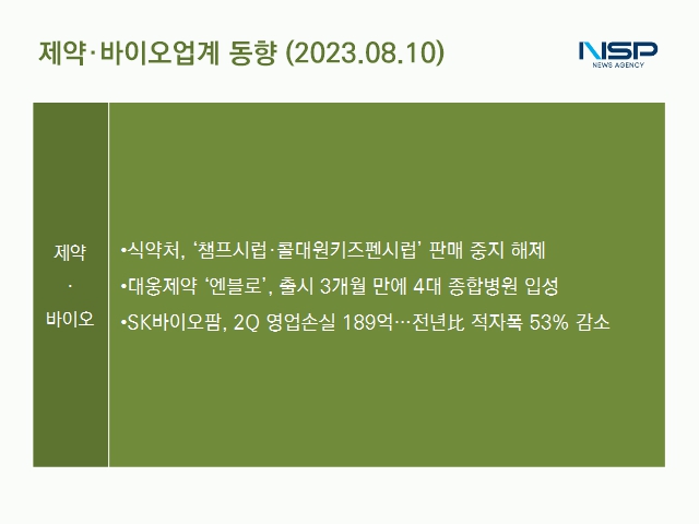 (서울=NSP통신) 김다은 기자 = 식품의약품안전처가 동아제약의 ‘챔프시럽’과 대원제약의 ‘콜대원키즈펜시럽’에 대한 제조·판매 중지 조치를 해제하면서 제품이 다시 판매될 예정이다. 이와 함께 대웅제약이 개발한 SGLT-2 억제제 당뇨병 신약 ‘엔블로(이나보글리플로진)’가 4대 종합병원에 입성했다.
