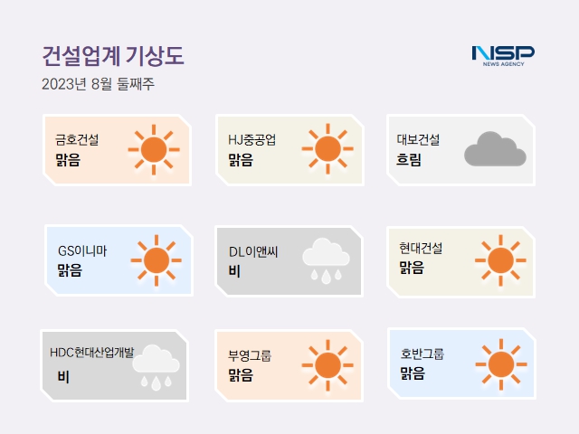 (서울=NSP통신) 정의윤 기자 = 2023년 8월 2주차 건설업계기상도는 금호건설·HJ중공업·현대건설·부영그룹·호반그룹·GS이니마의 ‘맑음’, 대보건설의 ‘흐림’, DL이앤씨·HDC현대산업개발의 ‘비’로 기록됐다.