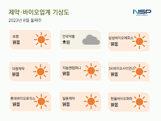 (서울=NSP통신) 김다은 기자 = 2023년 8월 둘째주 제약·바이오업계기상도는 보령·삼성바이오에피스·대원제약·지놈앤컴퍼니·SK바이오사이언스·롯데바이오로직스·일동제약·한올바이오파마의 ‘맑음’과 안국약품의 ‘흐림’으로 기록됐다.