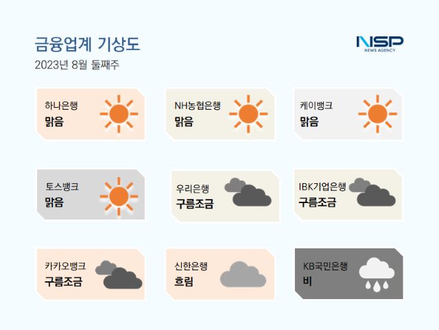 (서울=NSP통신) 강수인 기자 = 2023년 8월 2주차 금융업계기상도는 하나은행·NH농협은행·케이뱅크·토스뱅크의 ‘맑음’, 우리은행·IBK기업은행·카카오뱅크의 ‘구름조금’, 신한은행의 ‘흐림’, KB국민은행의 ‘비’로 기록됐다.