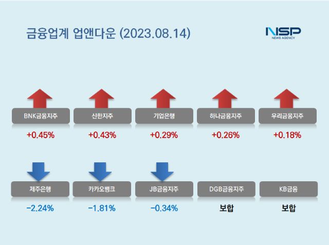 (서울=NSP통신) = 14일 코스피(-0.79%)와 코스닥(-1.15%)은 모두 하락했다. 이 가운데 은행주는 전거래일 대비 0.11% 하락했다. 은행주는 11종목 가운데 5종목이 상승, 4종목이 하락했다. 2종목은 보합세를 유지했다.